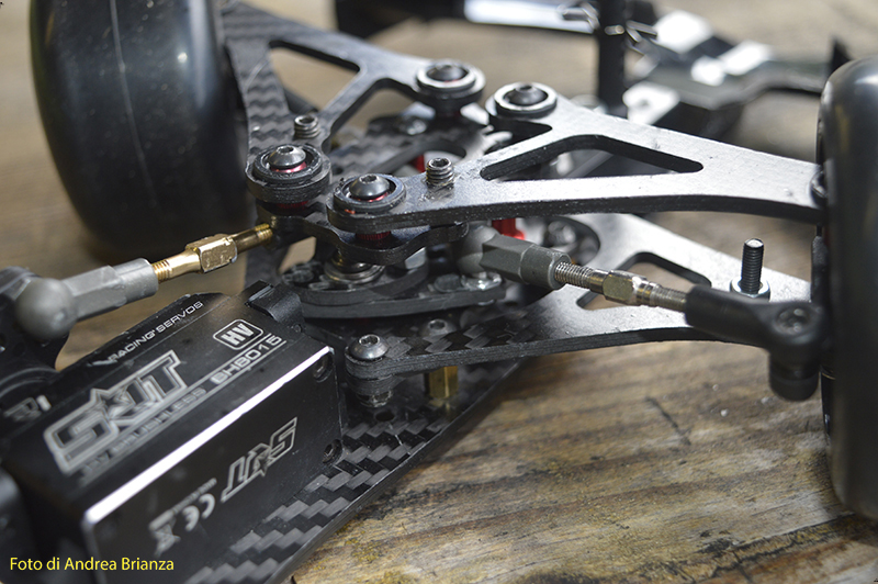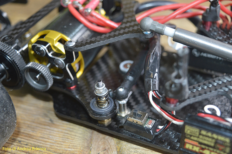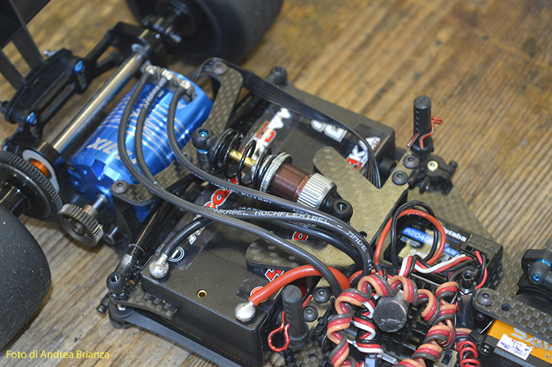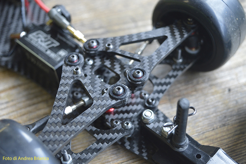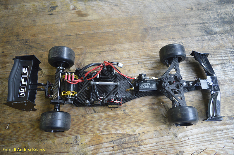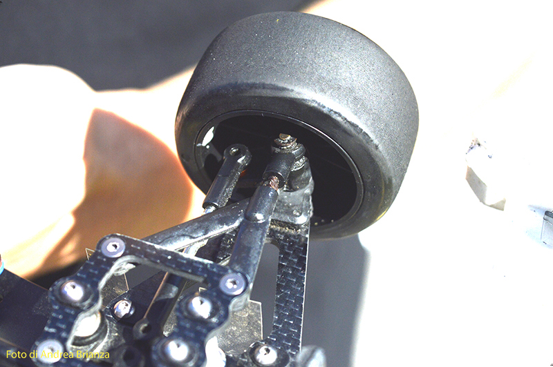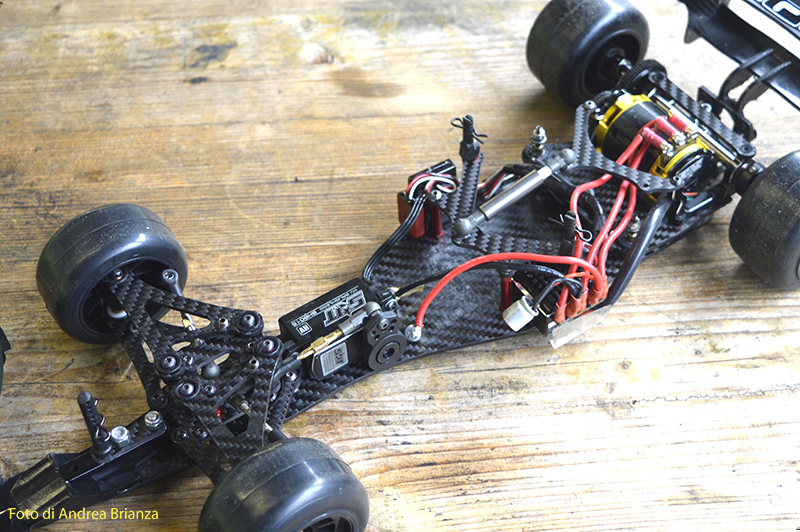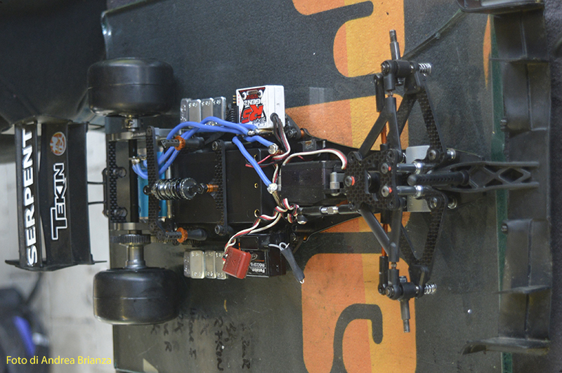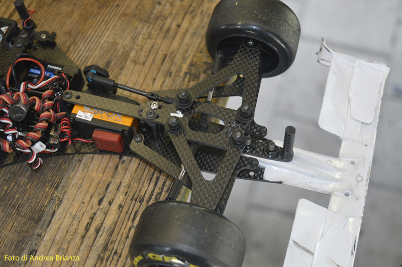 E’ un progetto interamente nuovo e innovativo. Innanzi tutto il telaio è intero, non tagliato davanti al motore come normalmente vediamo sulle altre auto. Il pod lavora sopra al pianale su tre molle. Una di queste è dietro al motore e regola l’affondamento come sulle nuove 1/12 di casa Schumacher. In pratica questa piccola molla abbinata a uno smorzino sostituisce l’ammortizzatore delle auto tradizionali. Sui laterali il sistema è quello di wrc con boccole e molle verticali, quindi la macchina non ha link.Batteria il linea molto avanzata e telaio strettissimo sono il cuore di questo modello Italiano portato in pista da Monzani e brevemente provato da me il venerdì sera. Ottime sensazioni di guida sulla pista ancora umida. L’avantreno non è definitivo, sarà più leggero, meno rigido e più semplice da montare.
