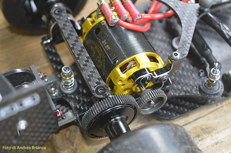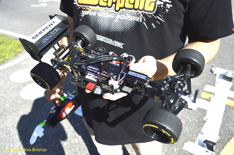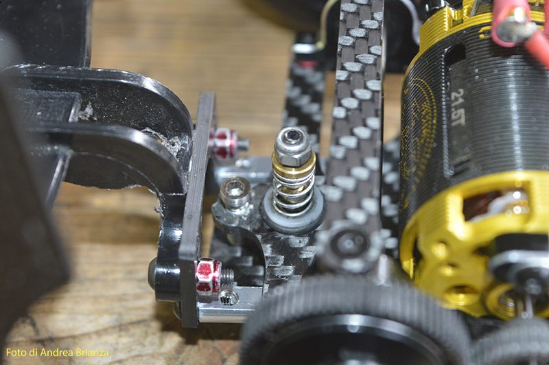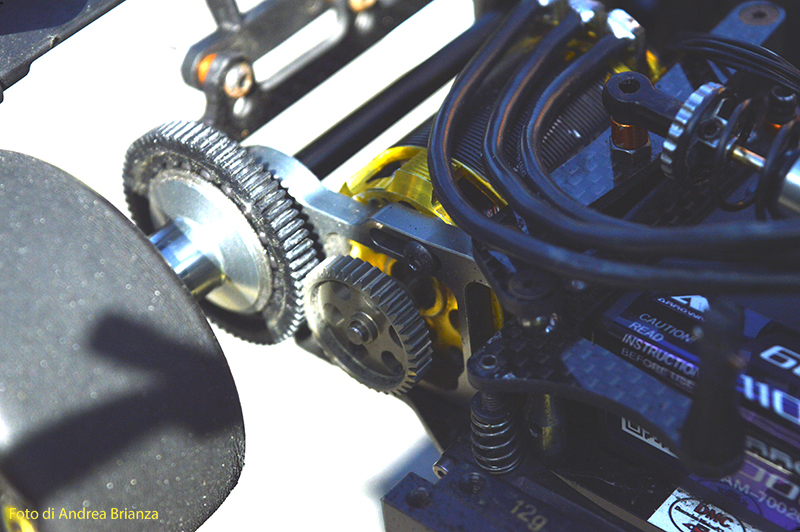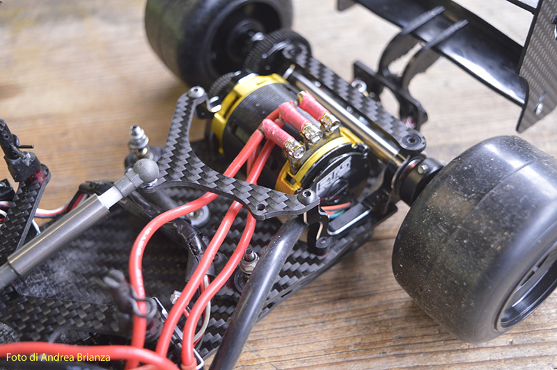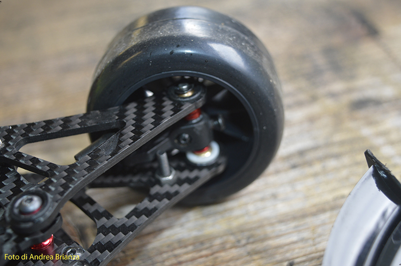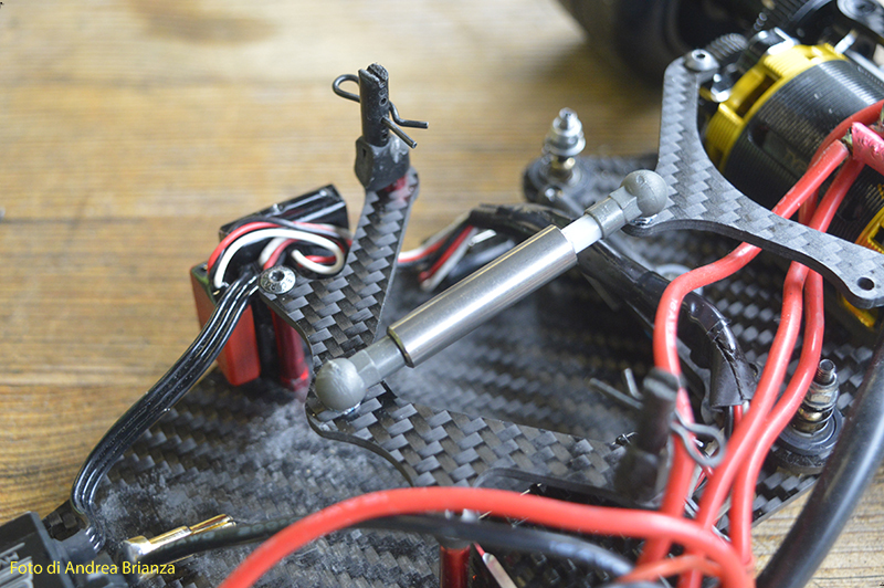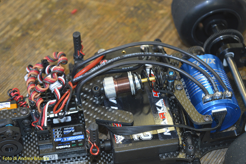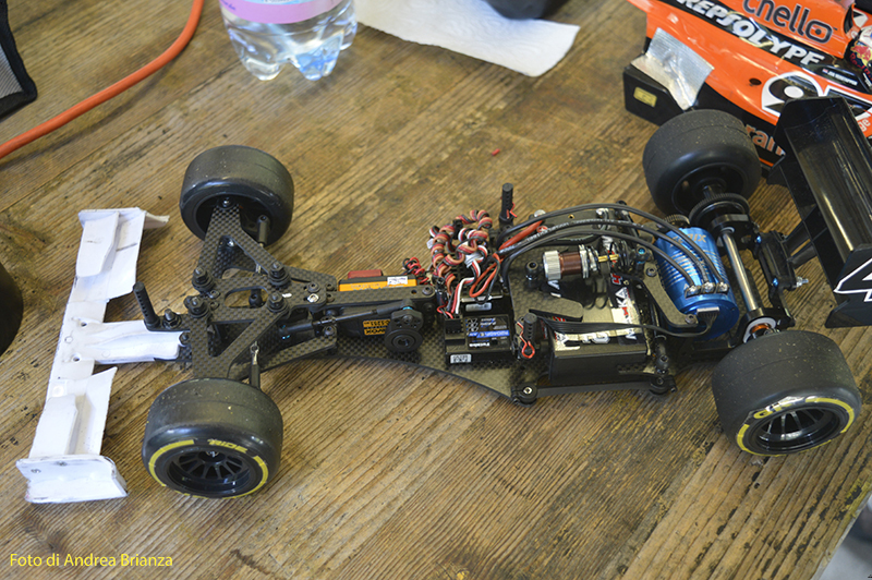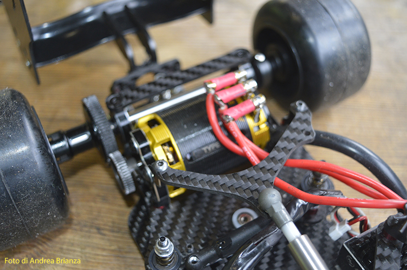 E’ un progetto interamente nuovo e innovativo. Innanzi tutto il telaio è intero, non tagliato davanti al motore come normalmente vediamo sulle altre auto. Il pod lavora sopra al pianale su tre molle. Una di queste è dietro al motore e regola l’affondamento come sulle nuove 1/12 di casa Schumacher. In pratica questa piccola molla abbinata a uno smorzino sostituisce l’ammortizzatore delle auto tradizionali. Sui laterali il sistema è quello di wrc con boccole e molle verticali, quindi la macchina non ha link.Batteria il linea molto avanzata e telaio strettissimo sono il cuore di questo modello Italiano portato in pista da Monzani e brevemente provato da me il venerdì sera. Ottime sensazioni di guida sulla pista ancora umida. L’avantreno non è definitivo, sarà più leggero, meno rigido e più semplice da montare.