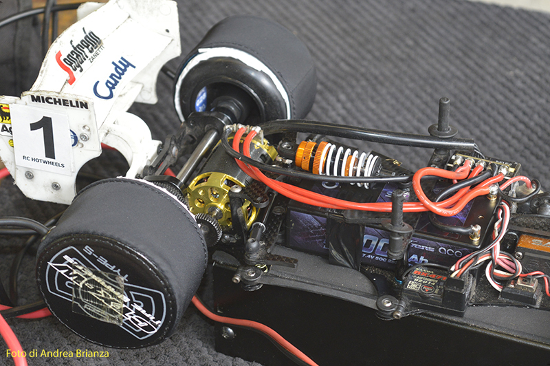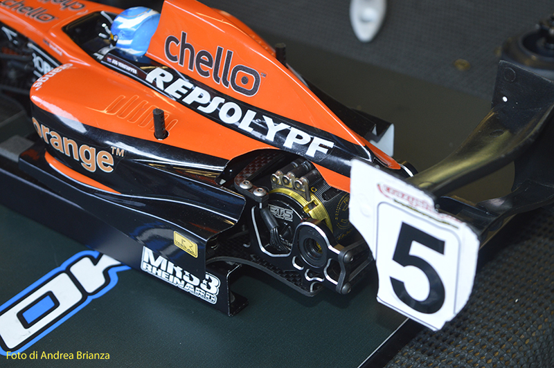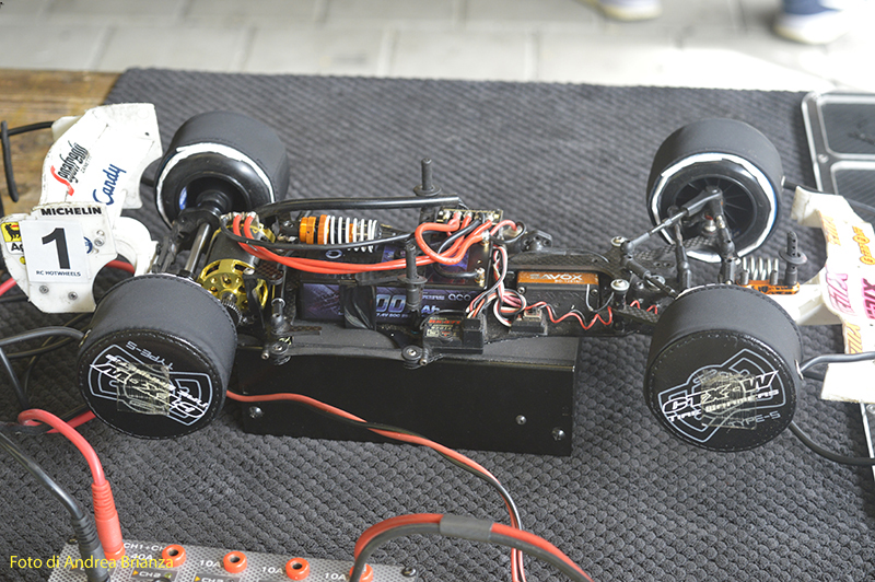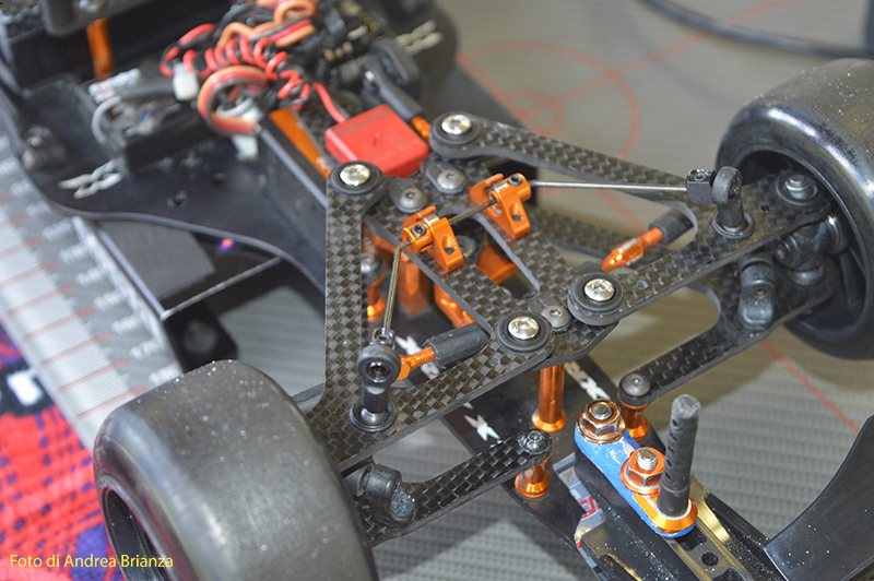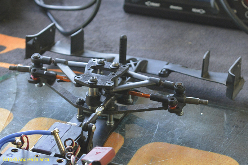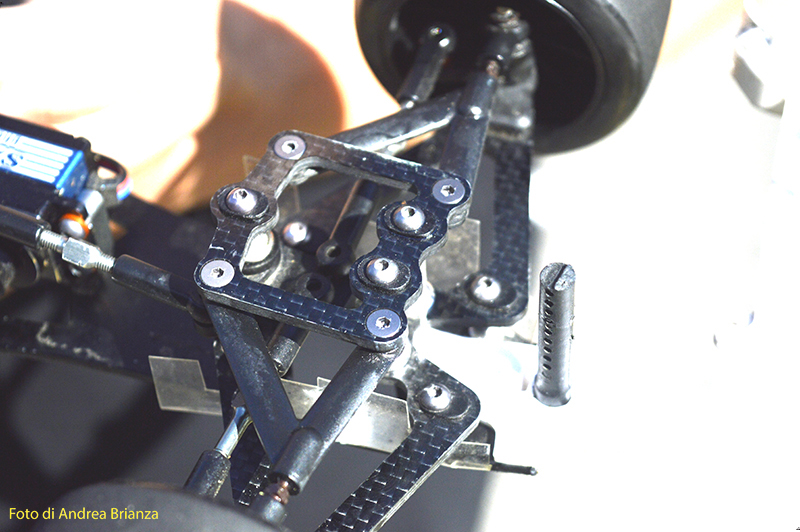 Spettacolare il nuovo banchino posteriore della macchina di Ehbar, praticamente sembra quello della 1/12, con un supporto ala di diverso disegno. Sulla sua macchina anche un nuovo supporto dei bracci anteriori, più leggero, quadrato e con diverse quote e misure rispetto quello in produzione per fissare i bracci. Per il resto la macchina sembra essere standard.